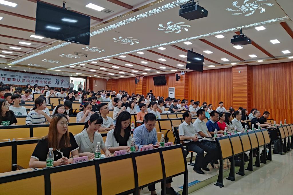 中国-东盟信息港鲲鹏生态创新中心首席运营官杨富强、人工智能学院院长葛丽娜、华为广西政企教育行业总经理何东岷、人工智能学院副院长秦董洪、浙江华为教育人才培养销售经理张乐锋、武汉誉天广西校区负责人杨秀,以及广西民族大学人工智能学院150多名师生也参加了本次开班仪式。